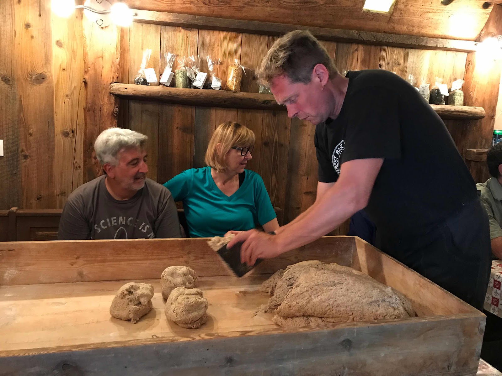 As soon as we got back we went to a bread making demonstration in an old house that is unique for still having a wood fired oven in the basement. Our host was Nicola, whose real job is working with plants at the local botanical garden. However, he has an avocational interest in bread making and in distilling grappa, which he infused with herbs from his work at the garden.
